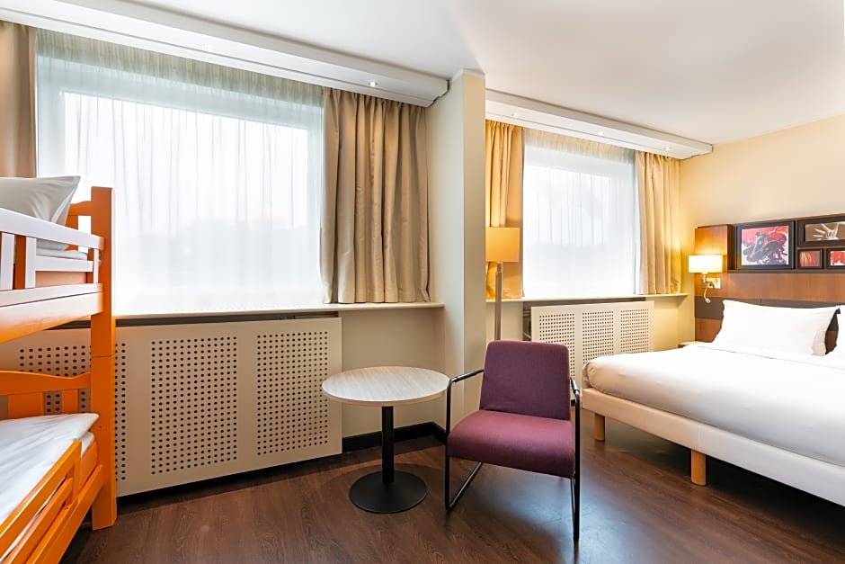 This family room features a king-size bed and a comfortable bunk bed for kids, air conditioning and seating area. Room rate includes access to the hotel's gym.